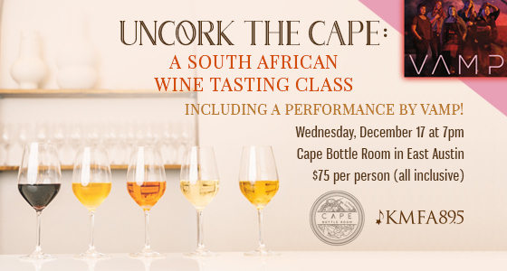 Join KMFA and Cape Bottle Room for a rich and immersive evening of South African wine, flavor, and music at Uncork the Cape—now rescheduled for Wednesday, December 17 at 7PM.