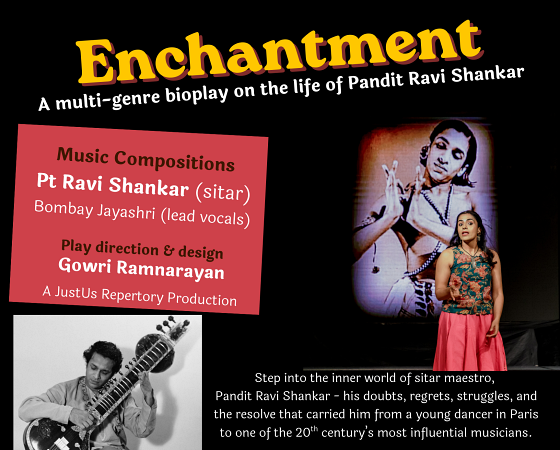Presented by JustUs Repertory, a boundary-pushing theatre collective known for blending modern theatrical techniques with the depth of Indian culture. With 26 acclaimed productions across India, the US, the UK, and South Asia — including a celebrated run at Soho Theatre — the troupe brings world-class storytelling to the stage. Written by Gowri Ramnarayanan and shaped by the maestro's own witty and poignant words, Enchantment weaves theatre, live dance, and music into a richly immersive experience. The production features Ravi Shankar's original sitar recordings and exclusive compositions rendered by Bombay Jayashri, with Aditya Prakash, Vignesh Ishwar, and Chaitra Sairam.