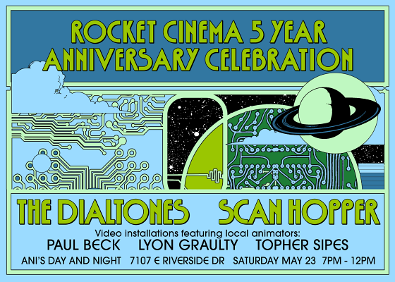 Join Rocket Cinema as they celebrate 5 years of showing movies outside under the stars in Austin.  Space rockers The Dialtones and Scan Hopper will perform, enveloped in outer space animations by artists Lyon Graulty, Paul Beck, and Topher Sipes at Ani's Day and Night, an eastside oasis with great drinks and fun vibes.  RSVP to enter the raffle for prizes like astronaut ice cream, vinyl from local bands, and other space themed goodies!