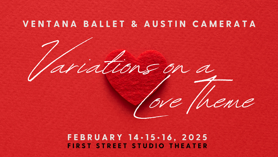 January 17, 2025—Ventana Ballet & Austin Camerata enchant the ATX performing arts scene again with Variations on a Love Theme in their third annual co-presentation. An Austin favorite, this intimate show brings the audience up-close-and-personal with the art. Limited seating at each showing immerses the guests in an unforgettable experience, as they travel through 8 different love stories, just inches away from professional dancers and musicians.