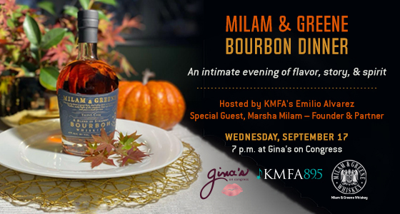 Gina’s on Congress invites you to an unforgettable evening of fine dining and exceptional bourbon, hosted by Milam & Greene Founder & Proprietor Marsha Milam, on Wednesday, September 17 at 7:00 p.m.