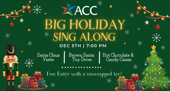 Please join the ACC Music Program for a family-friendly musical event. Doors open at 6:30 pm, with the event beginning at 7 pm. Come in your festive attire to Sing-Along or just enjoy! No admission fee, but we ask your generosity in donating an unwrapped toy to the Travis County Brown Santa.