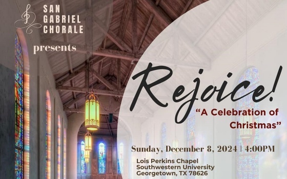 The San Gabriel Chorale, a community collaboration with Southwestern University, presents “Rejoice! A Celebration of Christmas” on Sunday, December 8th, 2024 at 4:00pm in the Lois Perkins Chapel at Southwestern University. The Chorale will be accompanied by brass and harp in performing Christmas music including works by Lauridsen, Hunt, Pinkham and Britten under the baton of Dr. Bruce Cain. Organ by Dr. David Polley. Tickets are $25, and are available at sangabrielchorale.com or at the door. Free for anyone under age 18. Free with SU ID.